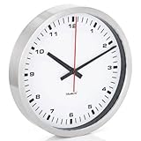 blomus stainless steel wall clock with white back and contrasting black hands. Silent quartz movement. Requires 1 AA battery which is included