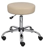 Upholstered in durable beige Caressoft vinyl for easy maintenance and cleaning, Adjustable seat height with a 6-inch vertical height range. Dual wheel casters allow for easy movement. Attractive chrome finish on the base and gas lift, Dimensions: Seat Size: 17-inch Dia., Seat height: 21-inch - 27-inch H, Overall Dimensions: 24-inch W x 24-inch D x 21-inch - 27-inch H