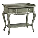 The Keely Accent Table will give your living room an elegant feel with its carefully distressed finish. Crafted from wood with soft French country details, this chic accent table is perfect for displaying home accents or a decorative table lamp. Its antiqued style will look great with a wide range of home decor. Fully finished back. Distressed details include clusters of small holes as well as decorative scratches and cuts. Actual size is 29"Hx31.25"W
