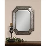 Frame is made of distressed, hammered aluminum with burnished details and rust brown trim. Mirror has a generous 1 1/4" bevel.