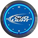 8BUDLI - Bud Light Clock Features: -Round clock features Bud Light logo.-Lit with blue neon lights.-4 Number dial.-Easily hangs on walls.-Takes 1 'AA' battery (battery not included). Includes: -12v AC adapter operates neon lights (included). Color/Finish: -Rim of clock has sleek chrome finish. Dimensions: -Dimensions: 14.5'' H x 14.5'' W x 3'' D. Warranty: -Exclusive one-year manufacturer warranty.