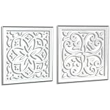 These ethnic, Moroccan design Mirrors feature selective, see-through areas which transmit the color of your wall when hung. An engraved, ridged accent line reflects light and highlights the edge of the mirror design. Each set of 2 has matching, separate designs, framed with a contemporary flush mount silver molding. The mirrors are light so they can be hung on a simple nail while hanging flush on the wall. Display this set of 2 in the grouping of your choice. Each framed mirror is 12-inch by 12-inch.