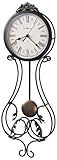 The Paulina Wall Clock by Howard Miller is a wrought-iron wall clock with decorative leaves and cast crown finished in charcoal gray with gold highlights and matching pendulum.