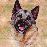 This creative canine image was created by Robert May, one of the world's leading canine artists. The image of the dogs head is depicted on a beige background in a lively pose. Robert prides himself on creating lifelike paintings of his subjects.