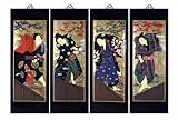 Beautiful lacquered painting wooden wall art plaques, very detail hand drawing japanese samurai and scenery in bright colors. It is a very distinctive set of wall decor pieces.Each Panel Dimensions: H32" x W12" x D1.25" Overall: H32" x W48" x D1.5"