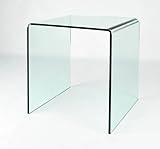 Side table made from one continuous piece of 12mm - or half inch - thick clear glass carefully bent into an arch shape. Can be matched up with other items in the Arch table range. Designed to be higher than most side tables to be accessible from the arm of a sofa or utilized as a lamp table. Natural clear glass with polished edges. Dimensions - 20 L x 20 W x 24 H inches