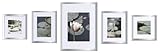 Silver solid wood 5-piece wall frame set with usable artwork. Includes 2-8x8 frames matted to 5x5, 2-8x10 frames matted to 5x7, and 1-12x16 frame matted to 8x10 or 8x12. Easy-to-hang templates and hardware included.