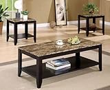 Make a statement in your living room with a three piece occasional table set that's sure to take center stage This versatile accent table group includes a rectangular coffee table and two matching end tables that make a stylish addition to casual or contemporary decor Marble look tops draw the eye with their muted shades of cream, onyx and gray and provide a durable yet beautiful surface for placing drinks and decorative accents A sophisticated finish wraps the base of the coffee and end tables, which feature lower shelves that offer additional space for storage or display Tapered feet finish each piece and provide a sturdy foundation for lamps, potted plants and decor Features: Includes a rectangular coffee table and two matching end table