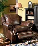 Traditional in style, elegant in design, the Coaster Furniture Leather Recliner possesses an inherent sophistication. It features a comfy pillow-style backrest, classic nail head trim and turned feet. This luxurious leather recliner exudes a vintage chic you're sure to enjoy for many years. Features: Individually placed nail heads highlight classic style Standard size Pocket coil fushion fill Hand rubbed red, Burgundy and cappuccino tri-tone leather finishNo two of this piece will have the same color patternHardwood frame provides support and shape Sinuous spring base ensures comfort 1.8" density cushion with dacron wrap Covered in top grain,split leather to provide high - end look Specifications: Overall dimensions: 39" W x 42" D x 3