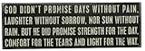 This sign reads "god didn't promise days without pain, laughter without sorrow, nor sun without rain. But he did promise strength for the day, comfort for the tears and light for the way." primitives by kathy is a leader in quality and desigin of decorative signs.