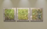 The 'Green Essence' modern art wall sculpture boasts a crisp lime green color highlight. This metal wall sculpture has been designed by a professional American artist, specializing in metalwork and modern feng shui. The raised, layered panels of this triptych sculpture add a lot of character to a minimalist design.